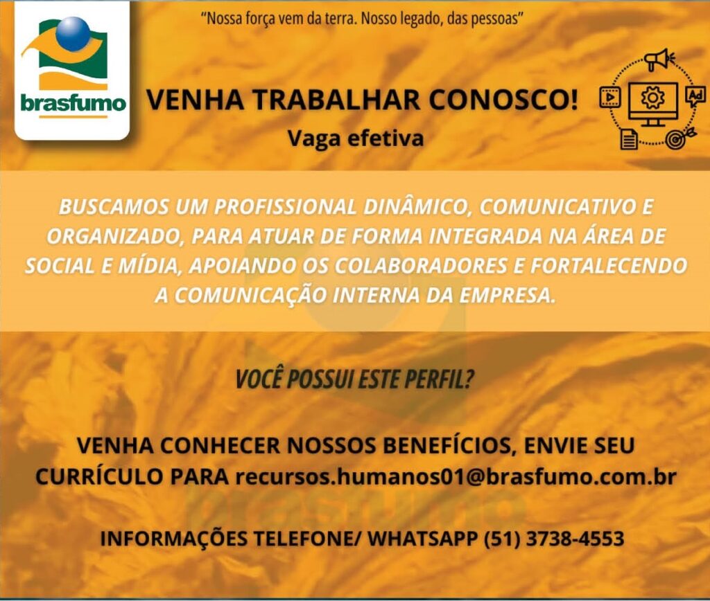 A Brasfumo está com nova vaga efetiva para atuar na área de Comunicação e Mídias. A empresa está em busca de um profissional qualificado para integrar sua equipe e contribuir ativamente para o fortalecimento da sua comunicação corporativa.