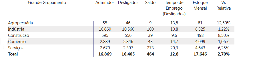 Somando todos os grandes grupamentos econômicos, o município contabilizou 16.869 admissões e 16.405 desligamentos no período de janeiro a dezembro, garantindo a ampliação do estoque de empregos formais.