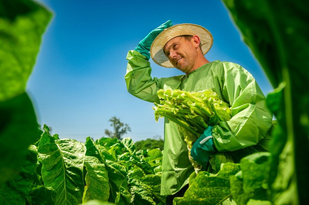 Colheita: use sempre luvas impermeáveis, botas, chapéu e a vestimenta de colheita e evite colher o tabaco quando as folhas estiverem molhadas pela chuva ou orvalho. Dê preferência para colher nos horários menos quentes do dia.